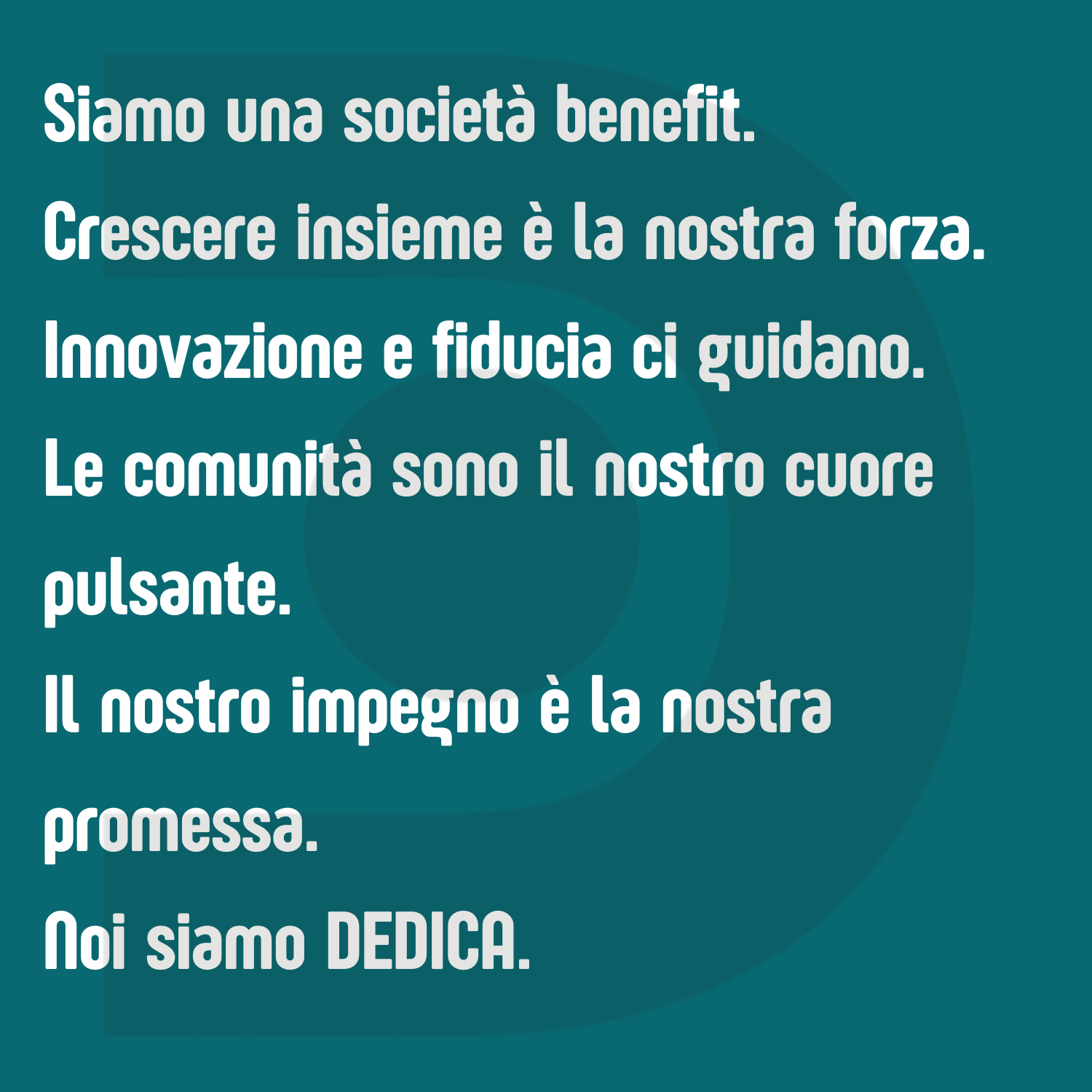Dedica si impegna a operare in modo etico, contribuendo al benessere della società e alla salvaguardia dell’ambiente. La nostra responsabilità sociale si riflette nelle pratiche aziendali sostenibili e nell’adozione di soluzioni che riducono l’impatto ambientale.